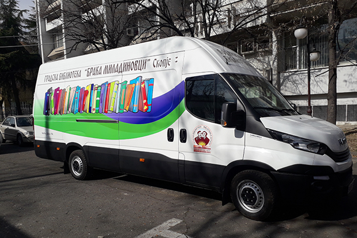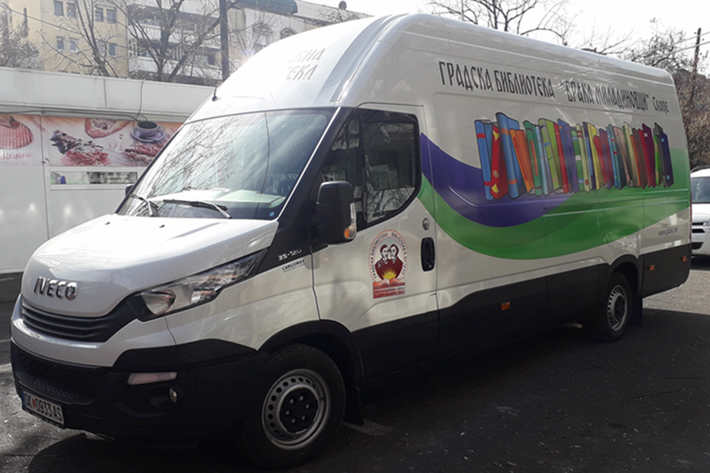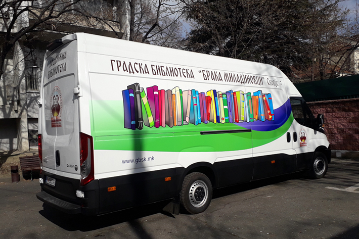 Подвижна патувачка библиотека – библиобус или подвижно библиотекарство, е адаптирано возило опремено со книги наменети за ученици. Библиобусот, од формирањето до денес, има за цел промоција на книгата, достапност на информации, развој на култура на читање и создавање навика за читање кај детската популација. Библиобусот посетува повеќе скопски приградски населби и села, односно 19 училишта во селата: Марино, Мралино, Бунарџик, Текија, Мршевци, Кучевиште, Сопиште, Сушица, Оризари, Припор, Долно, Средно и Горно Коњари, Добри Дол, Побожје, Долно Соње, Орман, Чифлик, Лисиче, Трубарево Волково. Учениците се ослободени од наплата за амортизација на позајмените книги. Подвижната библиотека работи пет дена во неделата, од септември до јуни, и ги посетува училиштата според претходно утврден план. Со библиобусот се овозможува полесен пристап и популаризација на книгата и до оние места кои се оддалечени од централните библиотеки и клонови. (мапа и распоред на движење на возилото).